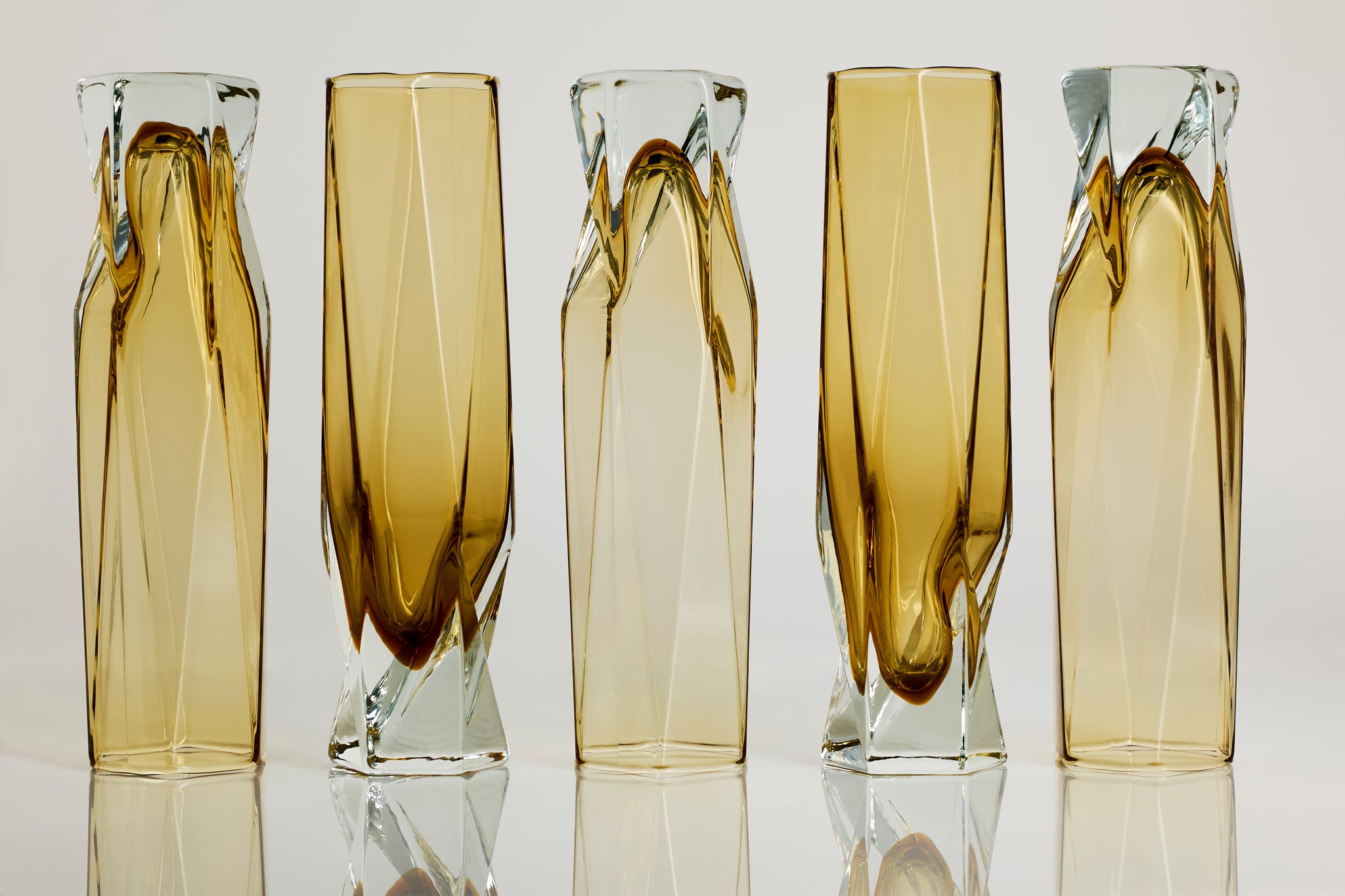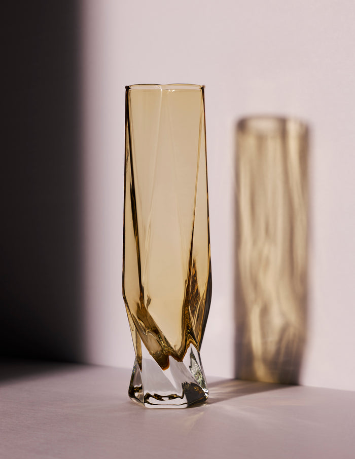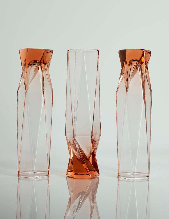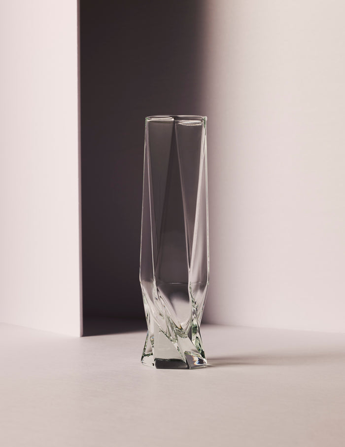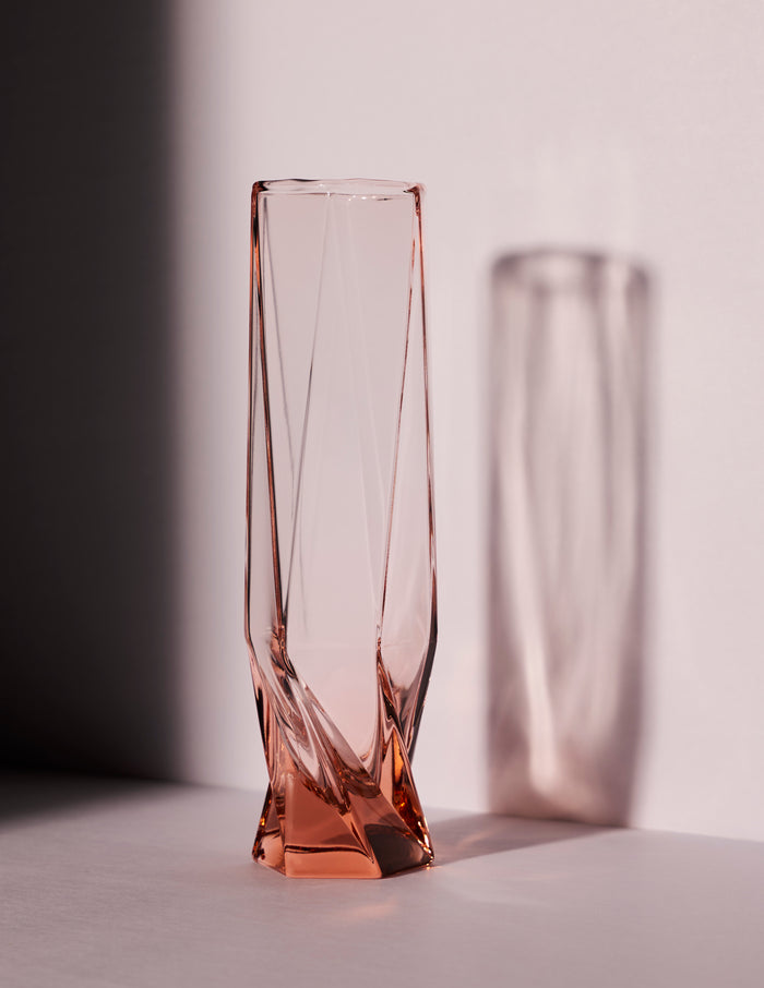 The twisting of the hexagon along the body of the design allows the glass to have a taper reflective of an hourglass shape, giving the glass a strikingly confident silhouette.